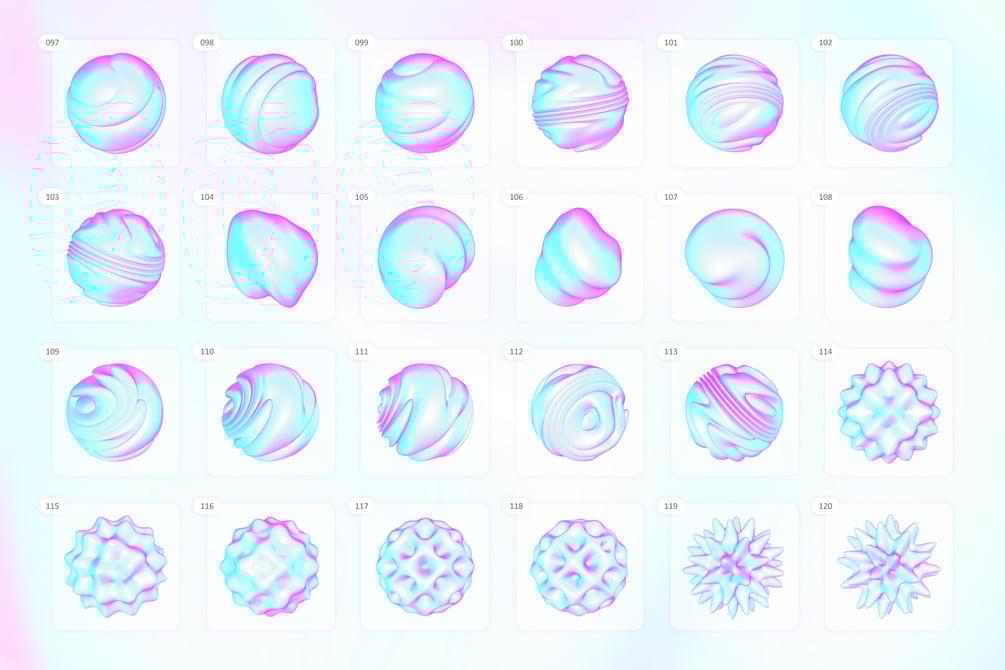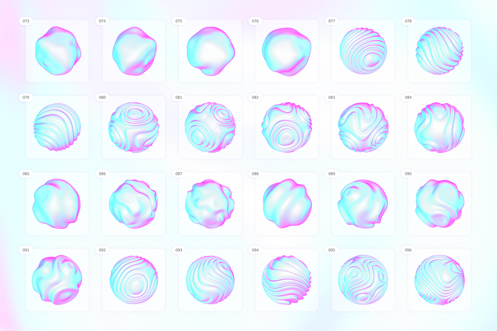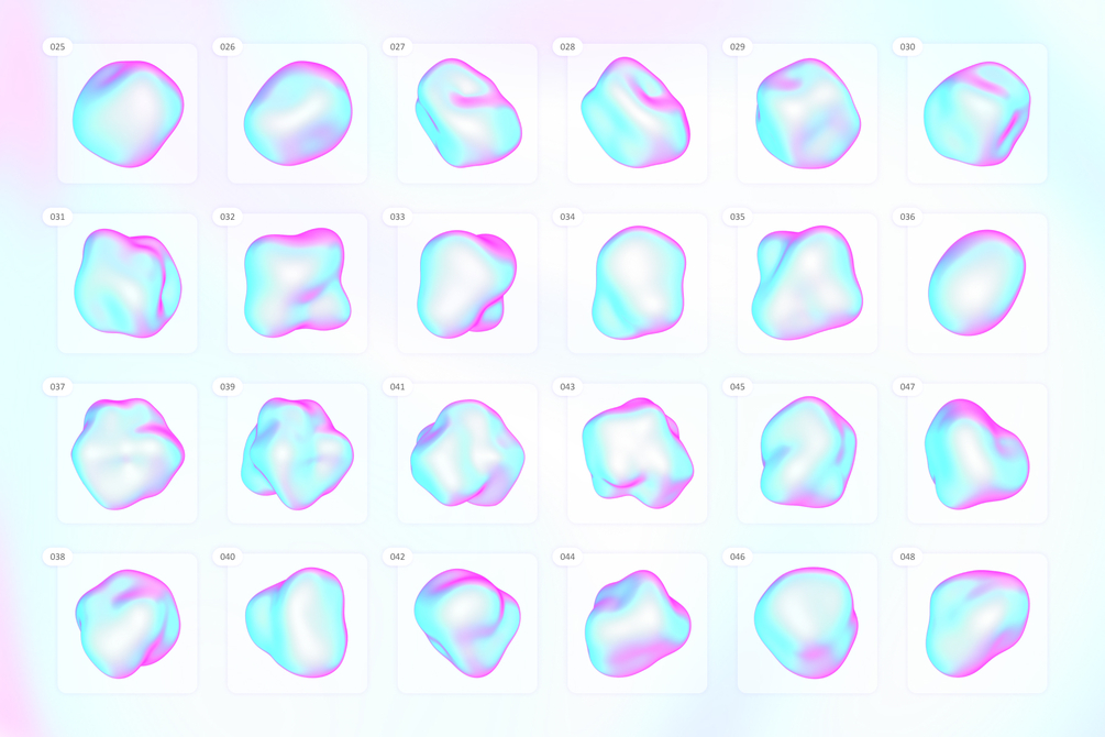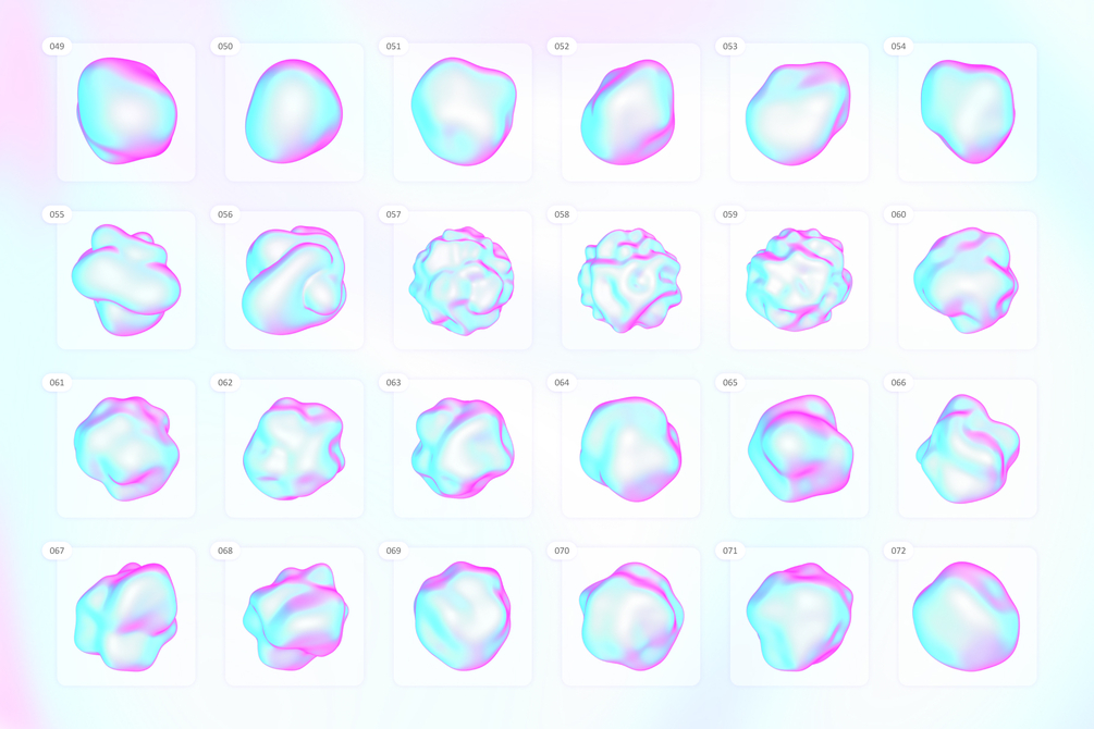 Holographic 3D Shapes Package is a versatile and powerful objects pack for designers. This package includes 120 vibrant organic elements, delivered in high-resolution 4000×4000px PNG file format with transparent background, compatible with any graphics editing software.